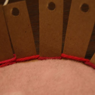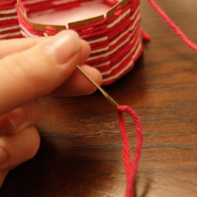 I didn’t count how many times I went around, probably six? I made it somewhat loose and fluffy. You’ll keep filling the holes in until you can’t see the cardboard anymore, or until the top looks as fluffy as you like, or until you run out of yarn. :) If you do run out of yarn, you can tie your piece off and thread up another, just take care to keep your knots hidden.