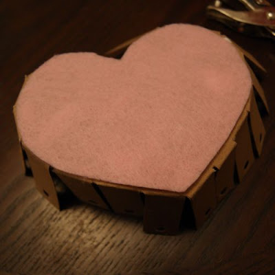I glued my felt on now to the inside and underside of my basket. It’s up to you, though. I will mention this – I don’t feel like I was really careful enough with the shape I added to the bottom side, and the edges of my cardboard showed a little (take a look near the point). So when you do it, be sure you cut your piece as closely as possible to your pattern so that it reaches all the way to the edges.