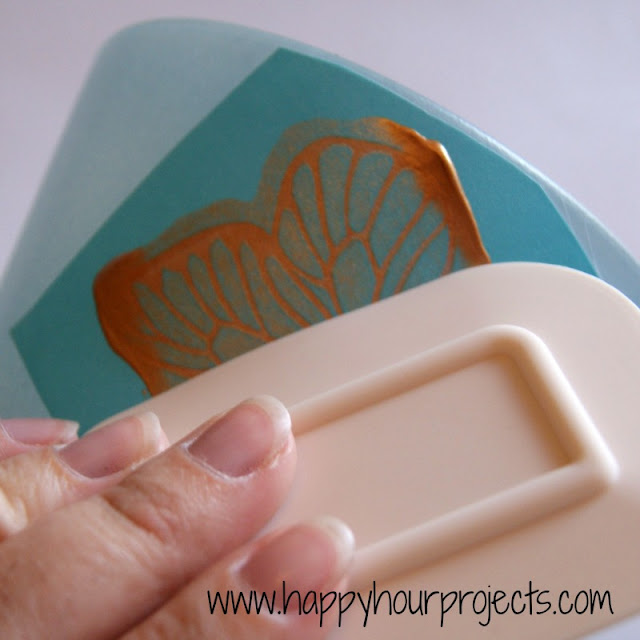 When that was fully dry, I used some of the new silkscreens to stencil some butterflies on it in a metallic bronze. The silkscreens are awesome in that you can create these intricate designs. I love the veining in the butterfly wings – something you wouldn’t be able to get from a traditional stencil. You just cut out the silkscreen you want to use, and place it on your glass where you want it. Add a line of paint across the top of the design – you’ll be spreading it down over all the tiny holes in the silkscreen.